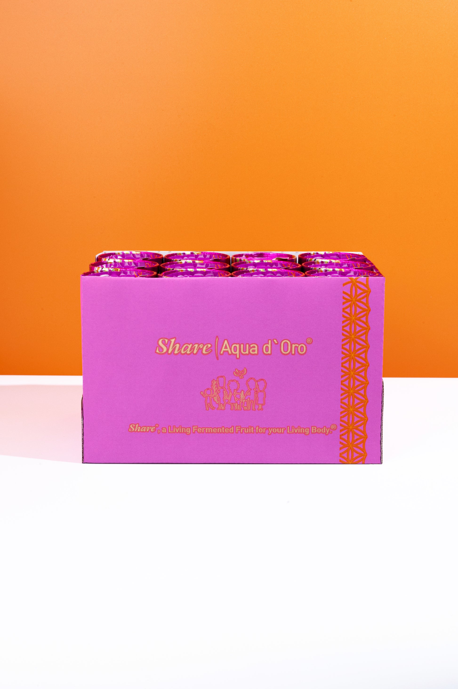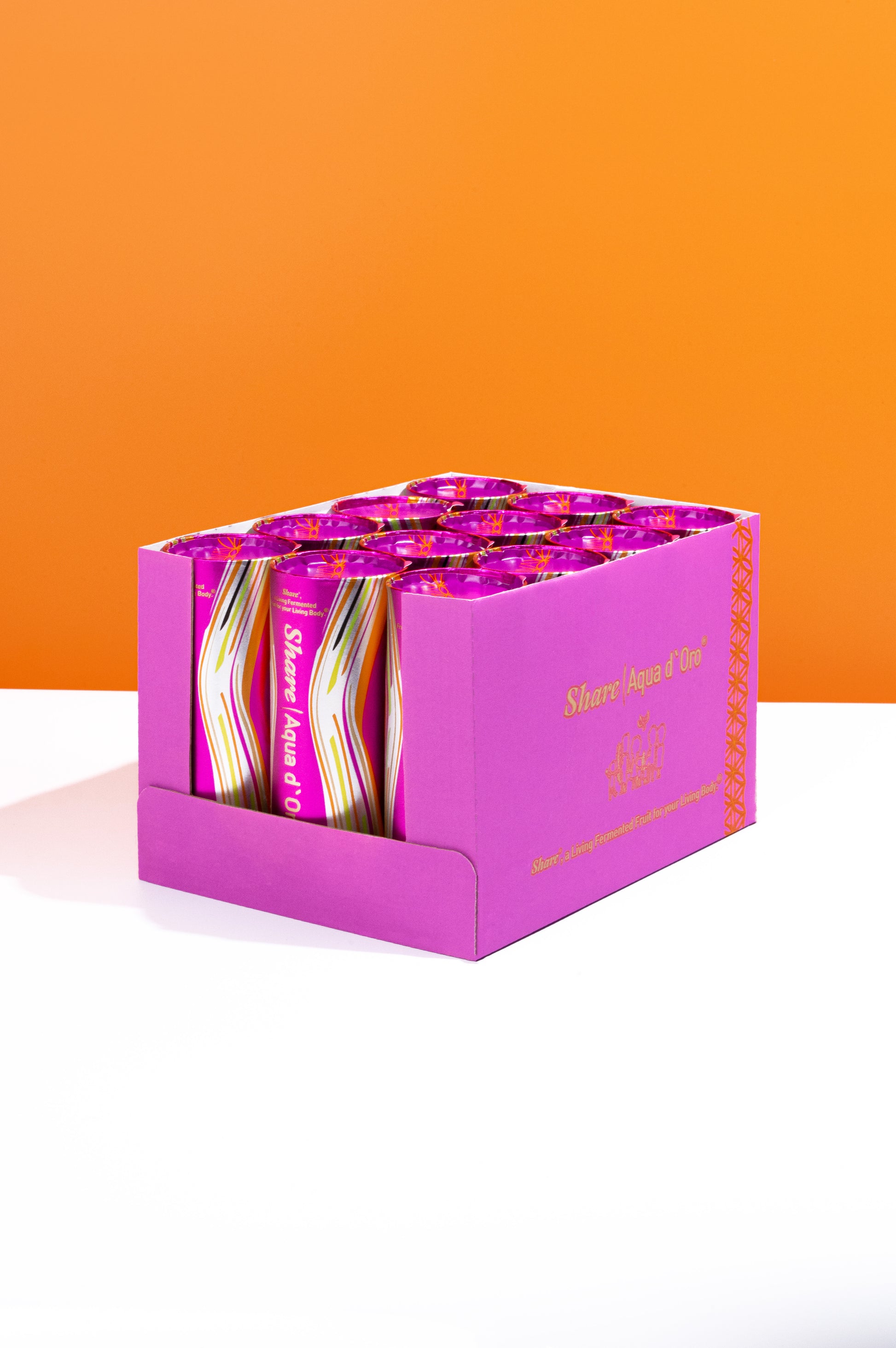 ShareAqua d'Oro® is a innovation: the first drink made exclusively from the juice of fermented fruits and vegetables. The "golden water" contains 24 different fruits and vegetables. With no added sugar, it's your perfect on-the-go companion. This makes ShareAqua d'Oro® the ideal complement to our Share®Original apricots and our Share Pomelozzini®.