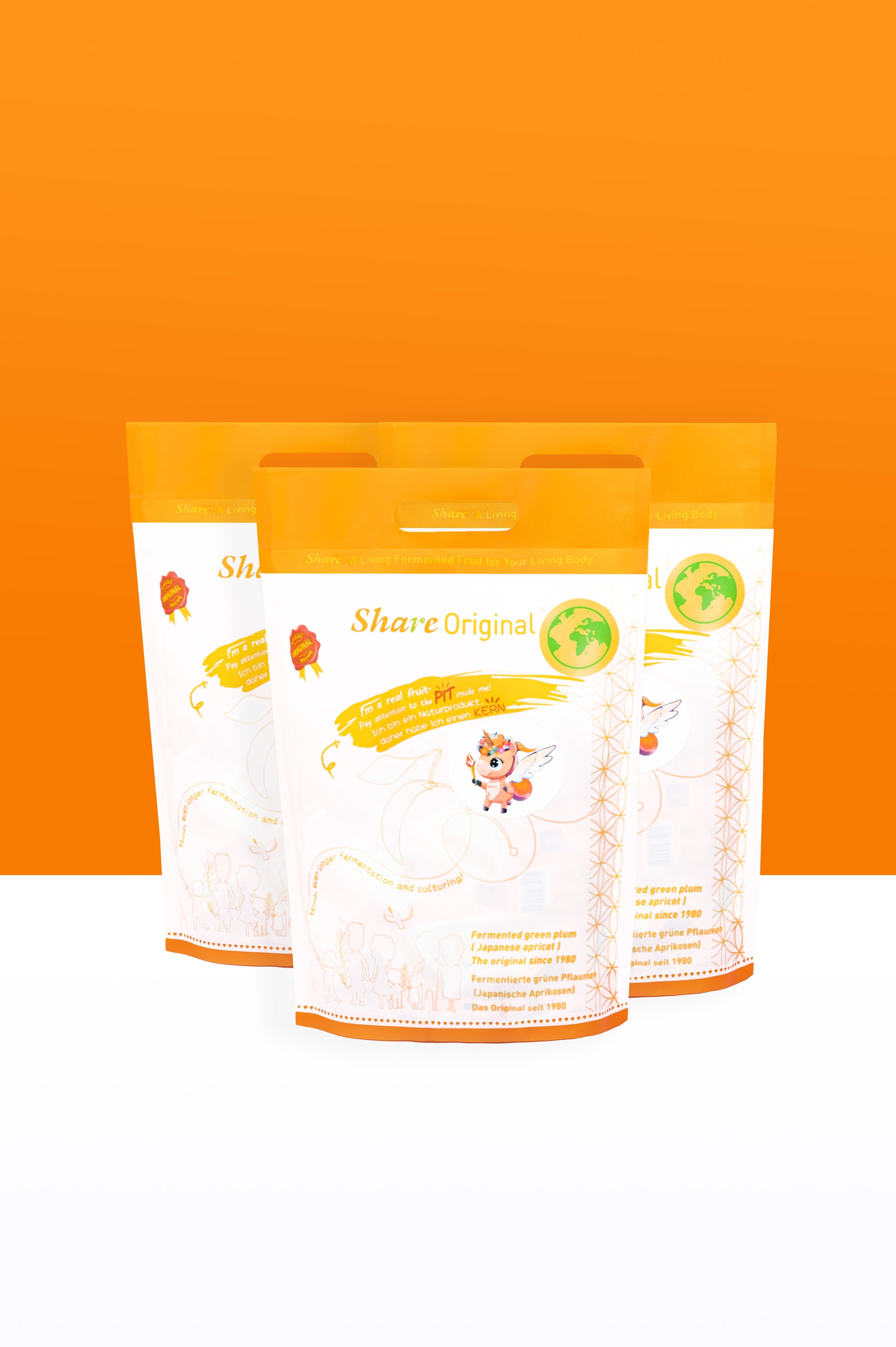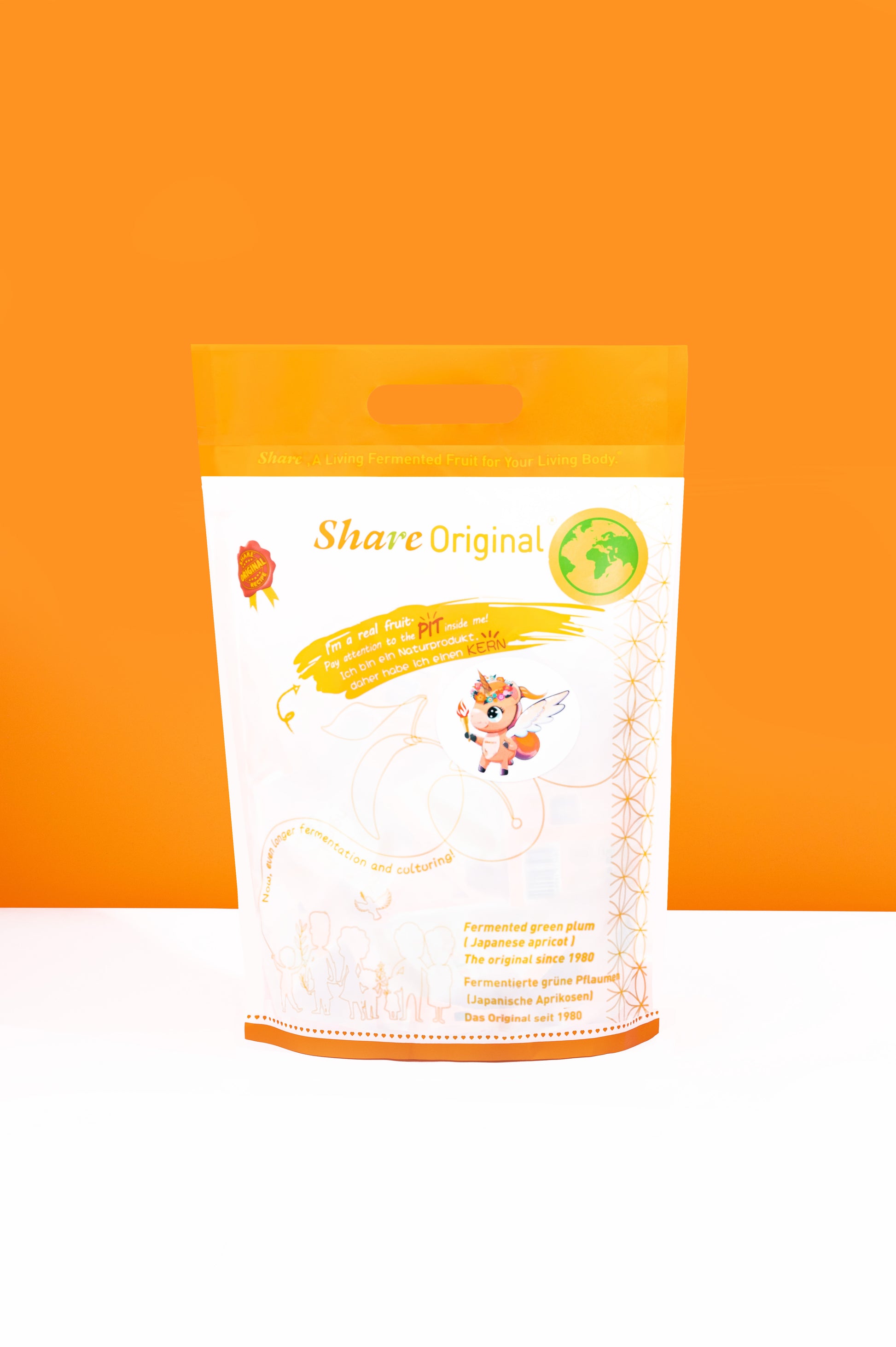 Our Share® Original plums are allowed to grow wild in a 150 km² bee sanctuary in South East Asia and are harvested by hand. We then ferment the "Prunus mume", the botanical name of the fruit, in its own fruit juice for at least 30 months. The recipe for this processing has been a well-kept secret for decades. Afterwards, our Share® Original plums are coated with high-quality herbs (mulberry fruit, yerba mate, natural carotene extract). And because, as we all know, the best comes at the end, we pack each plum airtight, so that another fermentation process can take place in the packaging.